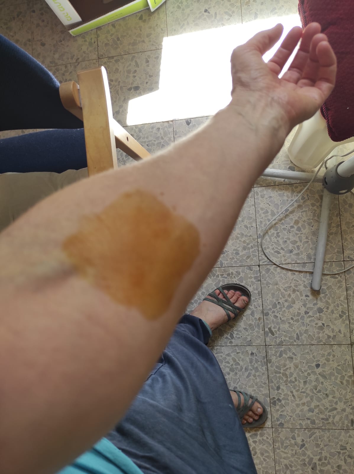 לוקחים את היד שלך, אזור האמה בין שורש כף היד והמרפק, בצד הרך, מטפטפים 2 טיפות (בלבד) על מקום שבו אפשר לצייר מהטיפות ריבוע של 5X5 ס"מ ומורחים את היוד לצורת הריבוע